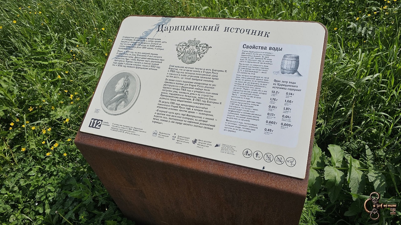 Царицынский источник в Старой Руссе. 73 литра воды даёт источник за секунду. 11 градусов — температура воды при выходе из скважины. Вода насыщена минералами и практически стерильна. Она наполняет воздух солевыми частицами, что ощущается во время прогулки у источника.